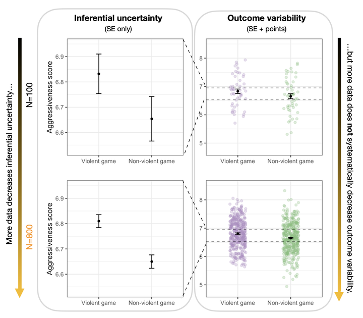 Traditionally, scientists have placed more emphasis on communicating inferential uncertainty (i.e., the precision of statistical estimates) compared to outcome variability (i.e., the predictability of individual outcomes). Here we show that this can lead to sizable misperceptions about the implications of scientific results. Specifically, we present three pre-registered, randomized experiments where participants saw the same scientific findings visualized as showing only inferential uncertainty, only outcome variability, or both, and answered questions about the size and importance of findings they were shown. Our results, comprised of responses from medical professionals, professional data scientists, and tenure-track faculty, show that the prevalent form of visualizing only inferential uncertainty can lead to significant overestimates of treatment effects, even among highly trained experts. In contrast, we find that depicting both inferential uncertainty and outcome variability leads to more accurate perceptions of results while appearing to leave other subjective impressions of the results unchanged, on average.